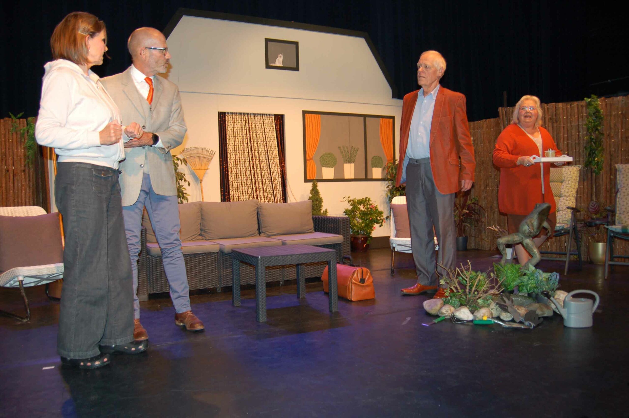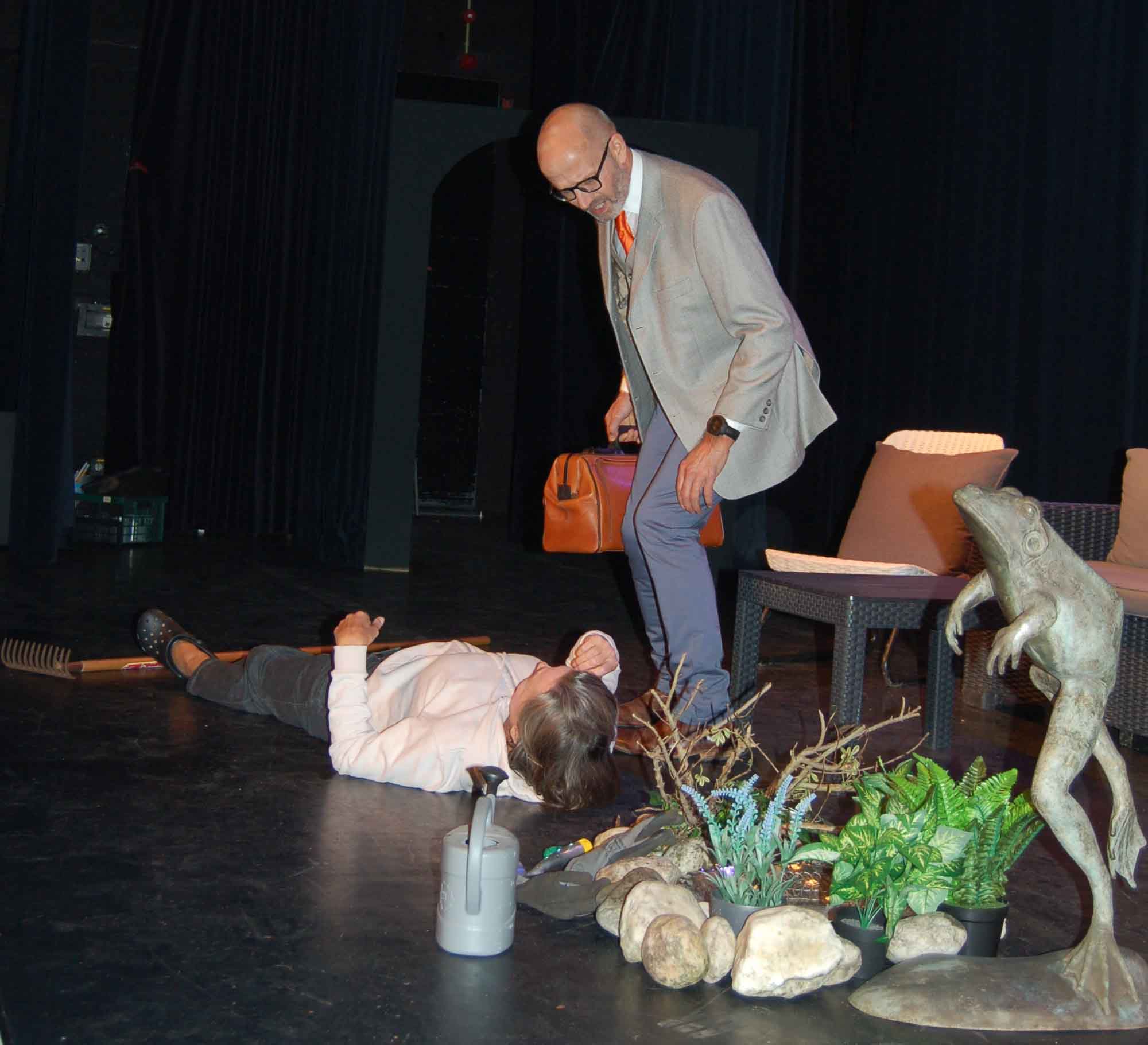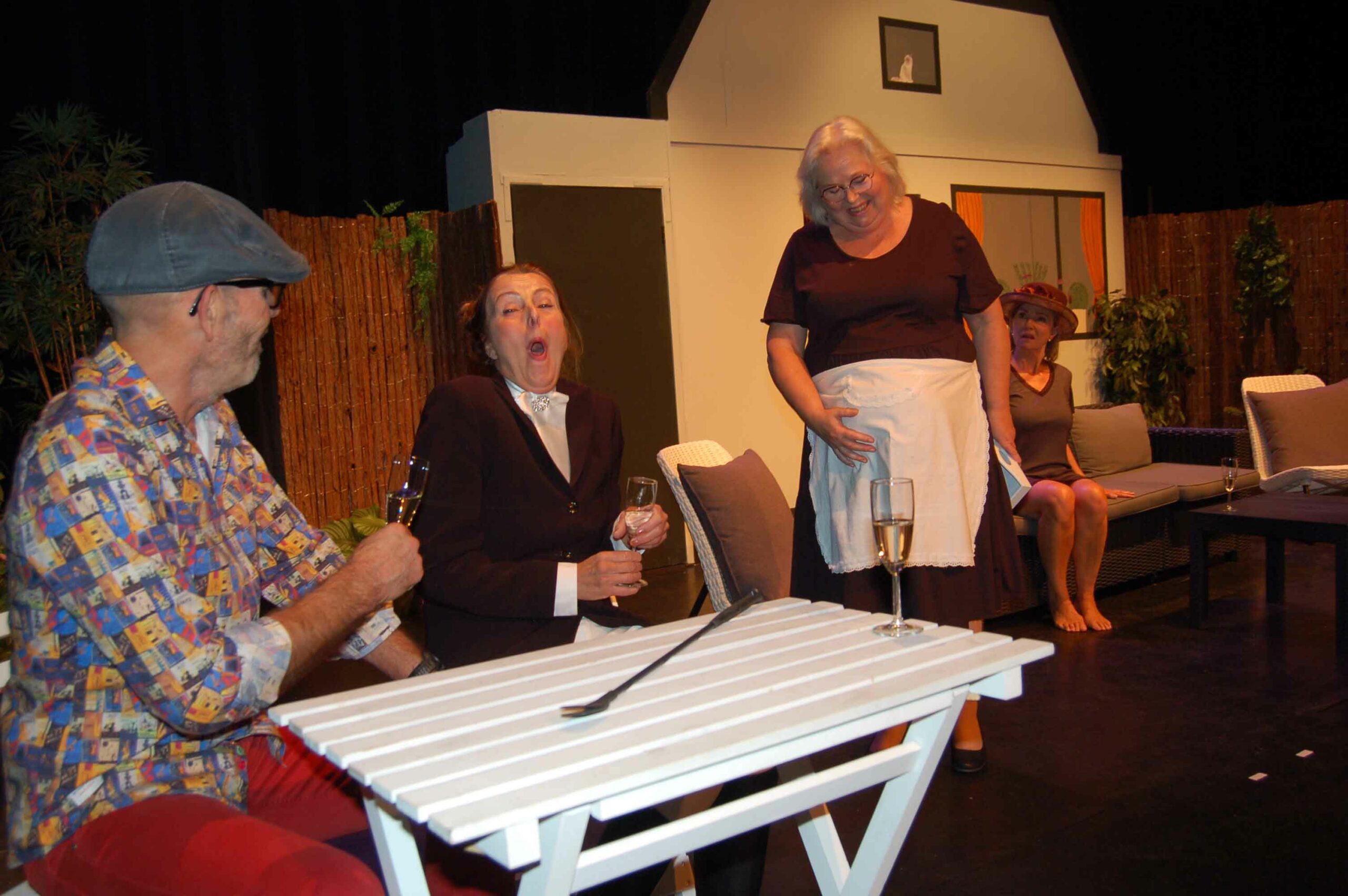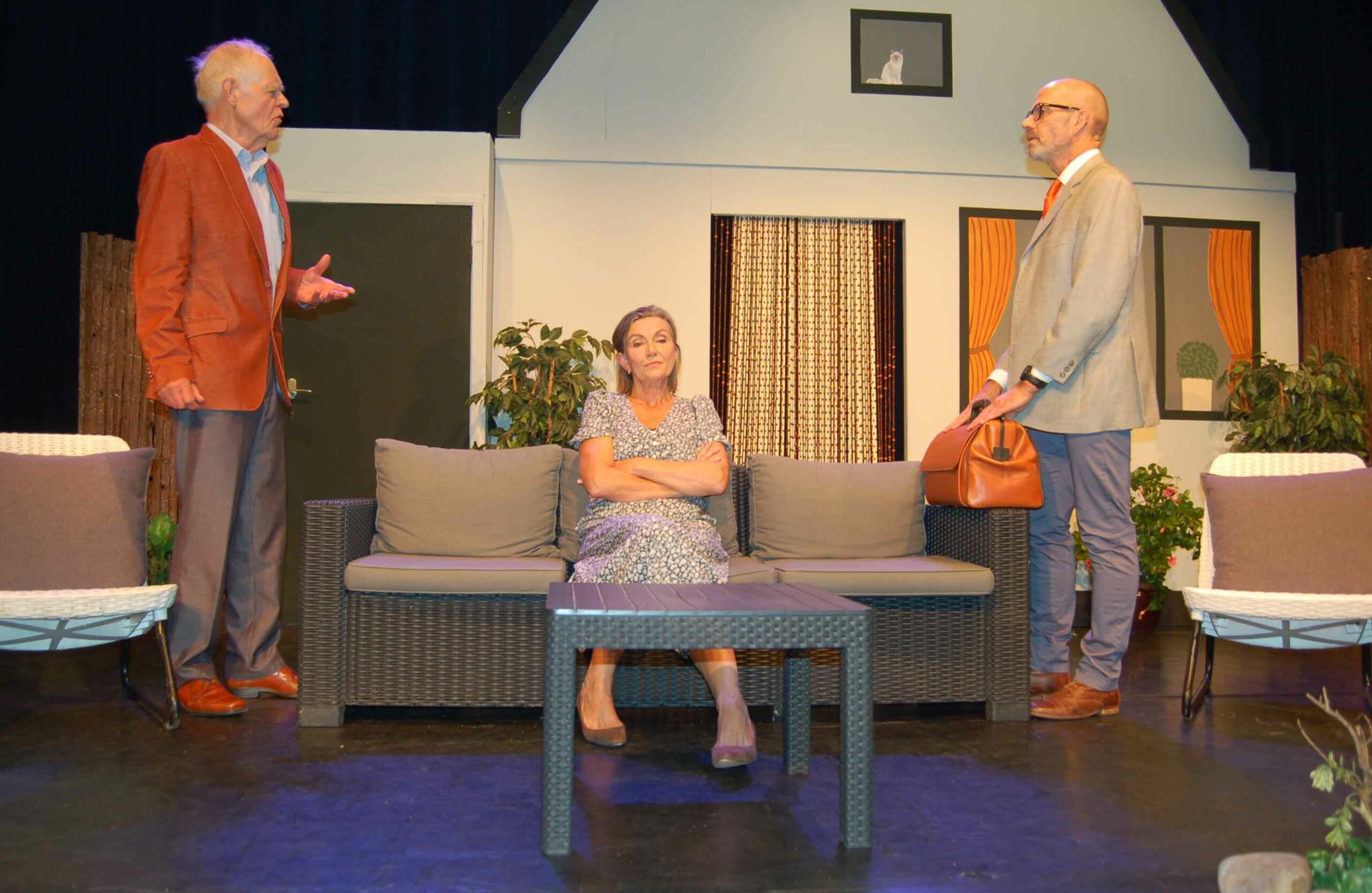 Erg inspirerend om te zien hoe een toneel vol met tekst- en rolvaste spelers duidelijkheid kan scheppen in twee dimensies: een zeer aan elkaar gewaagde grote cast waarin de stuntelige, toch meer dan professioneel(!) bezorgde arts (Richard van Delft) erg leuk uit de verf kwam. Cily Banus een drabbige, hysterische schoonzuster om te smullen neer zette en Hans van Amsterdam met verve de dominerende echtgenoot vertolkte. Wanneer tegen de finale de gehele groep als schitterend uitgedoste schertsfiguren uit een boze droom ten tonele verschijnt is de verwarring compleet.