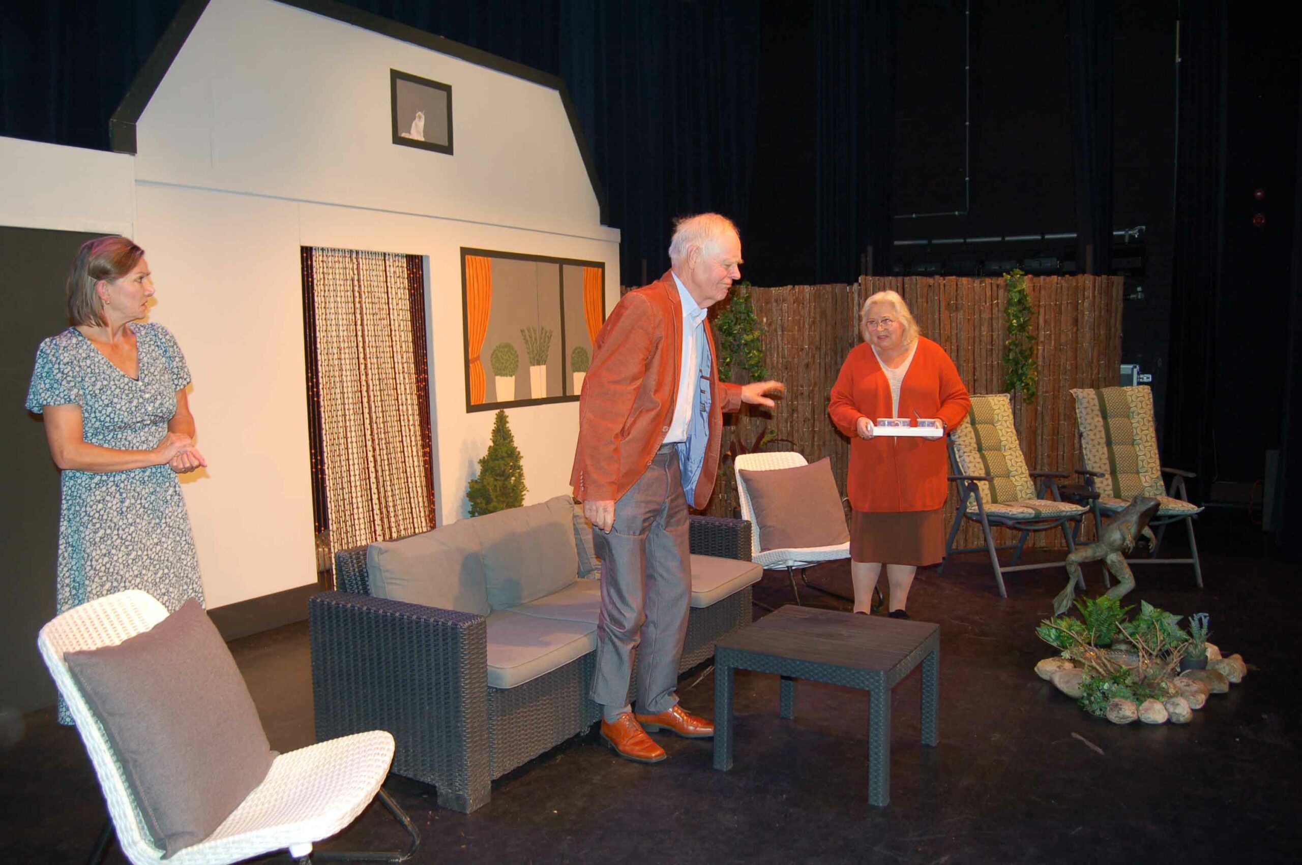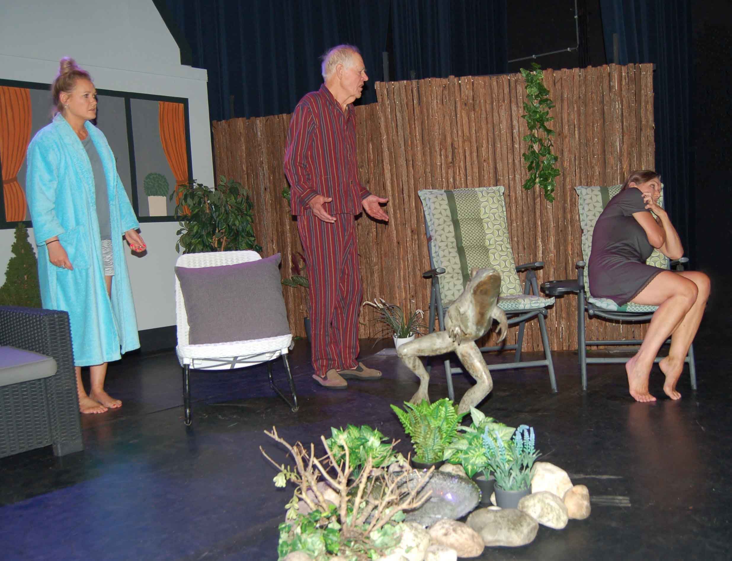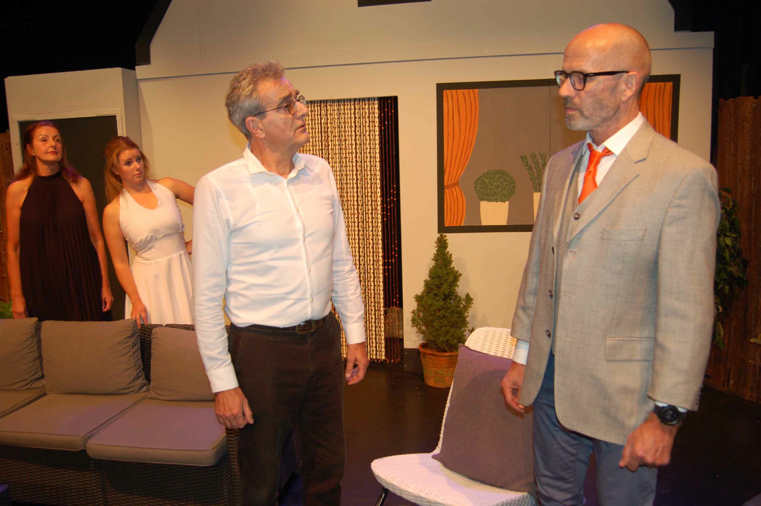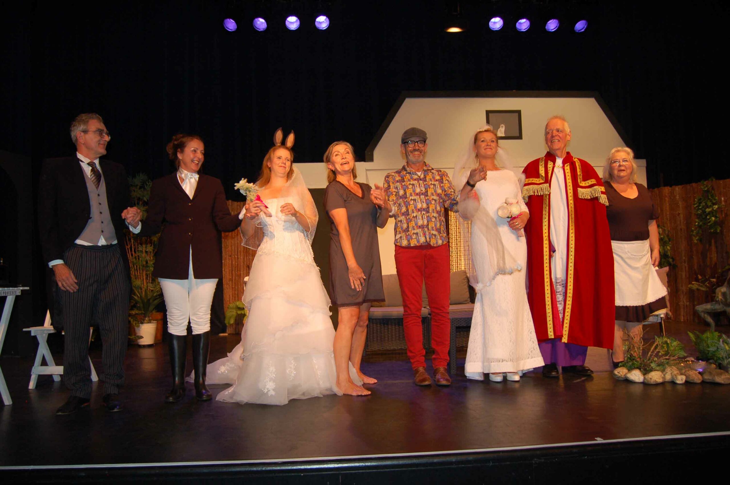 Erg inspirerend om te zien hoe een toneel vol met tekst- en rolvaste spelers duidelijkheid kan scheppen in twee dimensies: een zeer aan elkaar gewaagde grote cast waarin de stuntelige, toch meer dan professioneel(!) bezorgde arts (Richard van Delft) erg leuk uit de verf kwam. Cily Banus een drabbige, hysterische schoonzuster om te smullen neer zette en Hans van Amsterdam met verve de dominerende echtgenoot vertolkte. Wanneer tegen de finale de gehele groep als schitterend uitgedoste schertsfiguren uit een boze droom ten tonele verschijnt is de verwarring compleet.