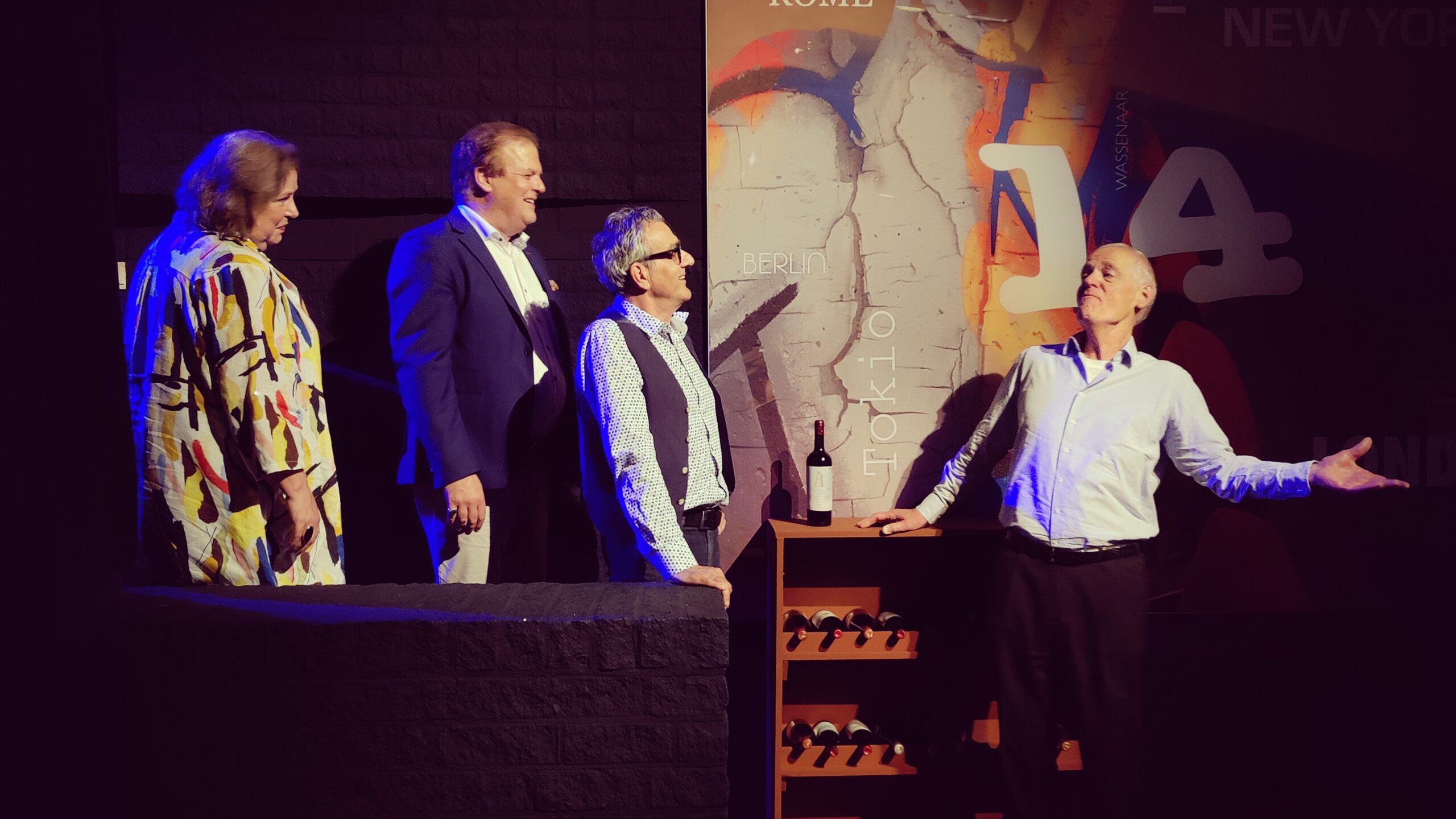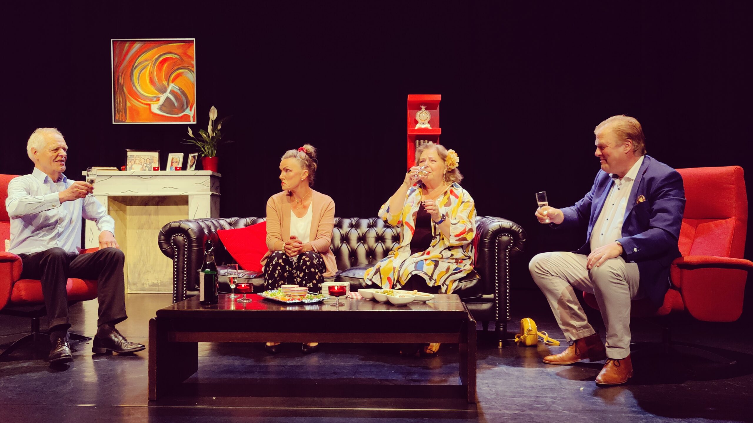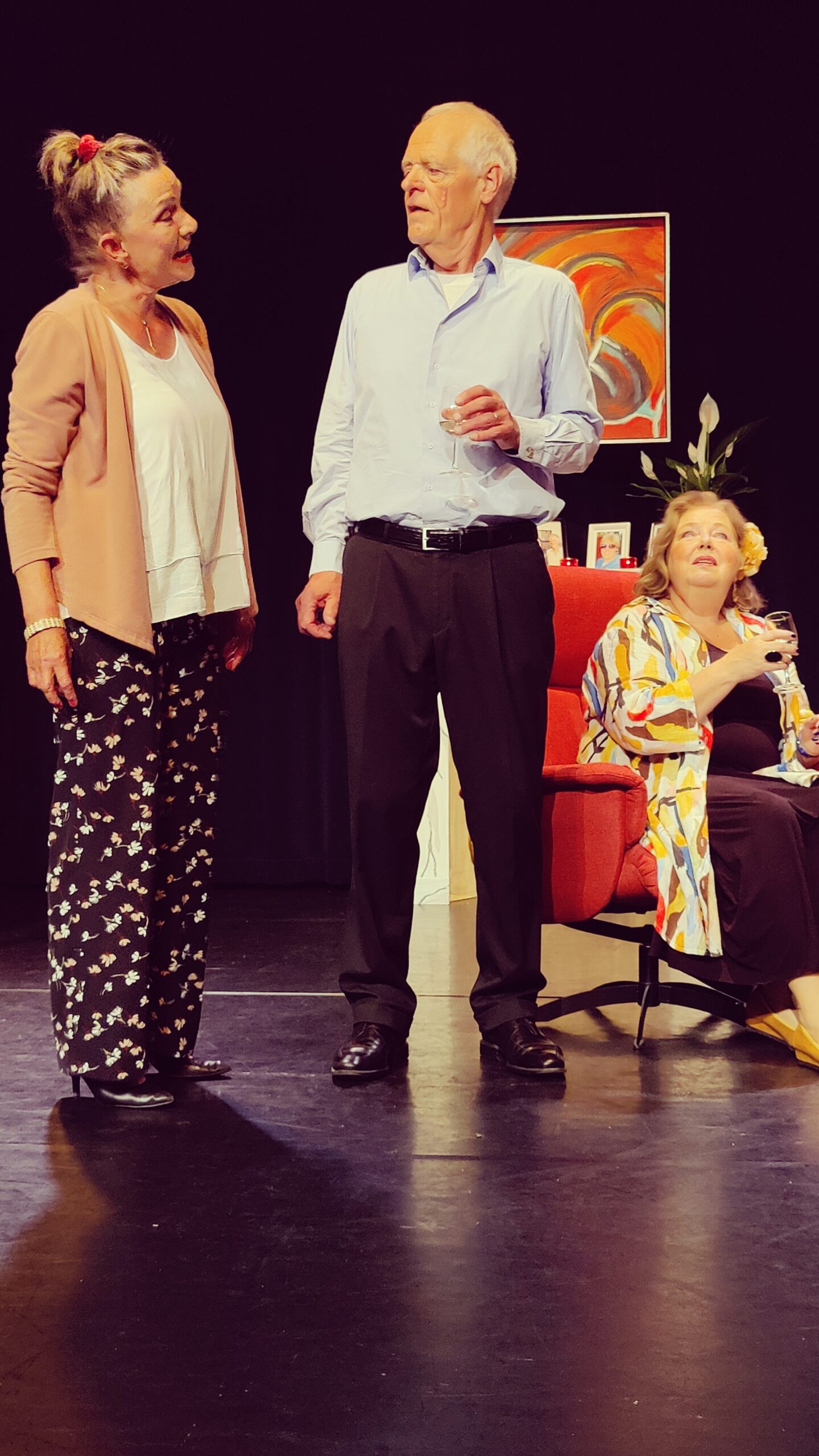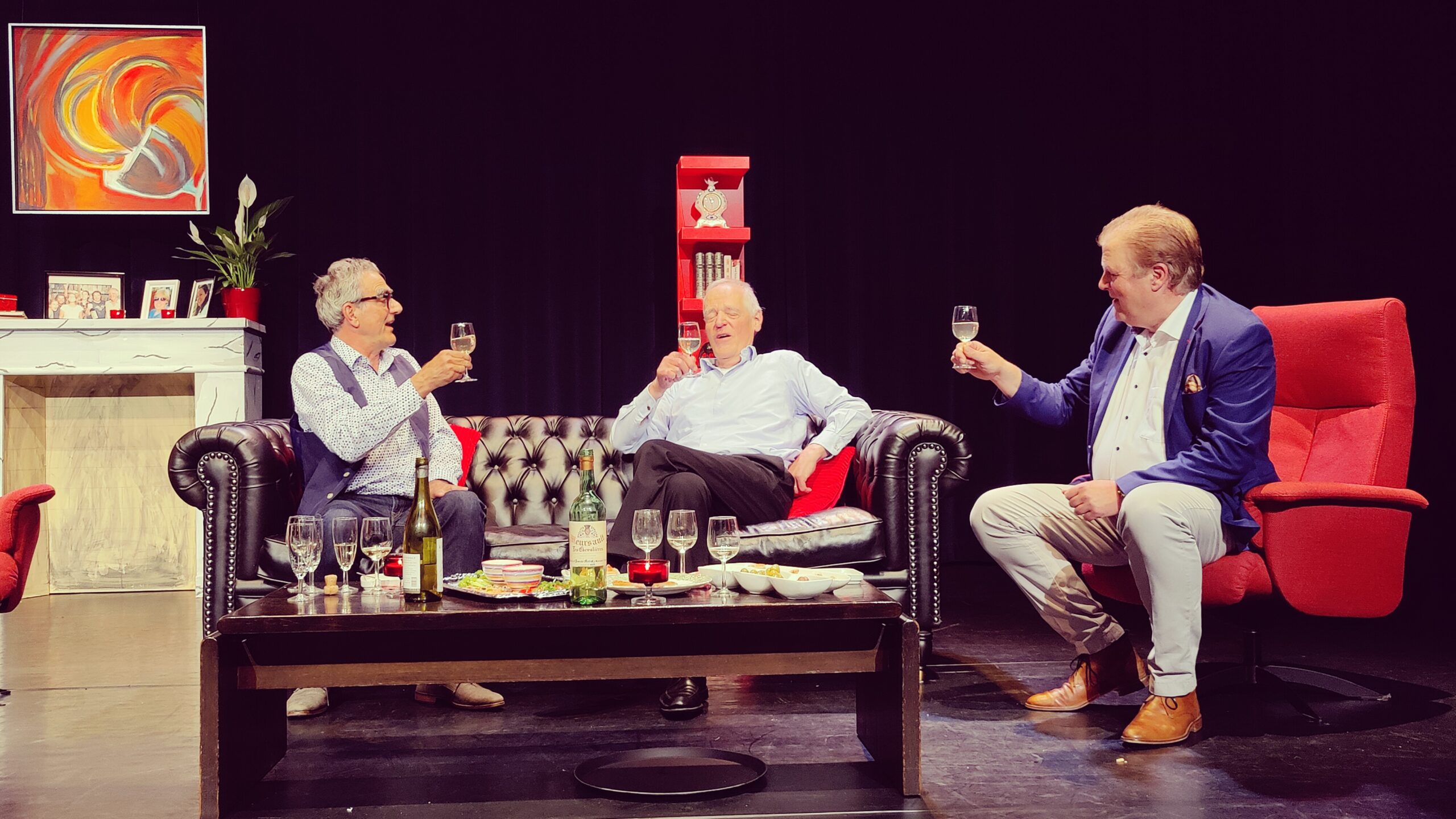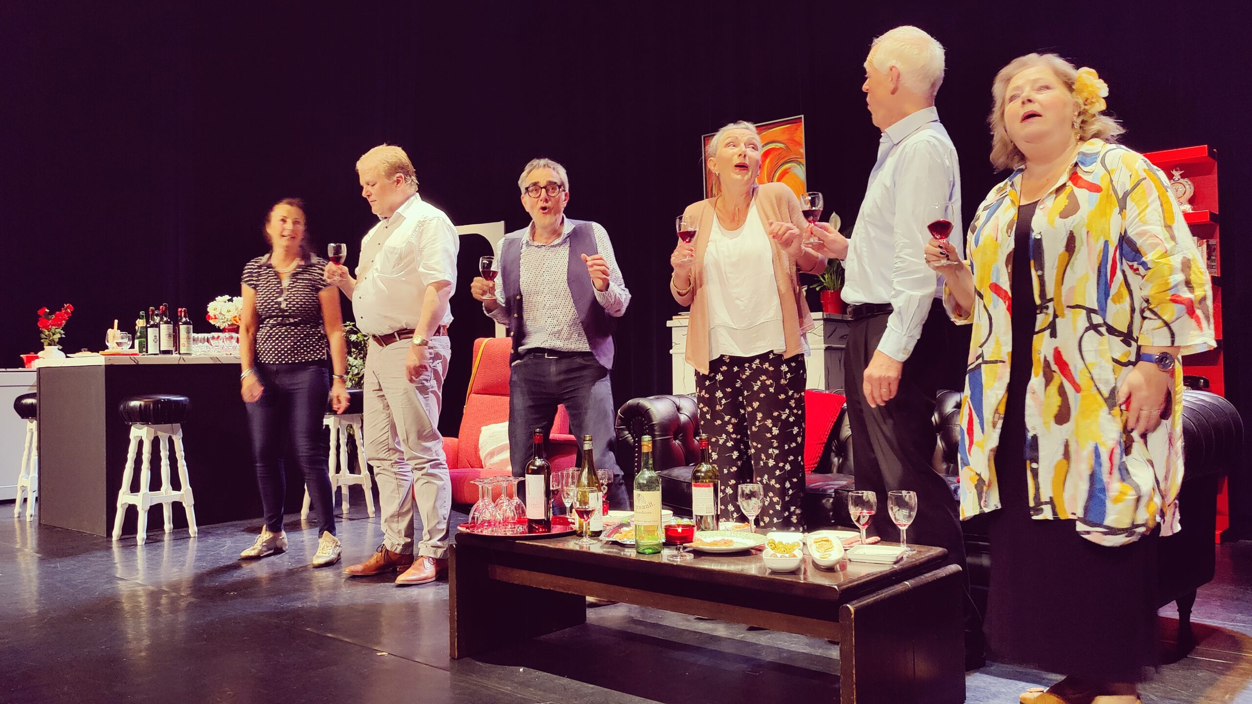 De openingstunes na het doven van het zaallicht doen in eerste instantie vermoeden dat er een soepel kabbelend wijnavondje op het programma staat. Het prominent aanwezige schilderij, dat de stijlvolle huiskamer domineert boven wat later een klein huisaltaar blijkt, is voor meer interpretaties vatbaar. Wijn maakt de tongen los tussen complexe vriendschappelijke (?) verhoudingen. Het echtpaar dat hier woont ontwikkelt zich door groot verdriet, blootgelegd door de voorstelling heen, zodanig twee kanten op, dat een scheiding onvermijdelijk lijkt. Een bekend fenomeen in het werkelijke leven bij het verlies van een kind! Gastheer Charles, vertolkt door Hans van Amsterdam, etaleert gaandeweg koortsachtig een fenomenale feitenkennis rond de geneugten van wijnproeverij. Het is prachtig om hem wanhopig zijn gevoelens te zien verbergen door telkens meer flessen uit zijn wijnkelder aan te slepen. Een kelder die overigens heel vernuftig zijdelings van het decor in beeld is gebracht en waaruit veel meer opgediept wordt dan de aanvankelijk cynische en kille gastvrouw, de met haar mimiek al zo expressieve Marijke van Amsterdam, kan verkroppen. Wijn staat hier symbool voor al wat bedekt is door de jaren heen: verbinding, maar ook splijtzwam tussen het getormenteerde echtpaar en hun pleegdochter, en de twistappel in het spel, de overleden zoon des huizes – gesymboliseerd door een exquise fles Petrus- dient sowieso niet ontkurkt te worden! Wyncko Tonckens als Bob, oude vriend des huizes, tracht goedmoedig en vol eigenwaan de gemoederen te sussen die zijn echtgenote (Cily Banus) vilein en quasi onschuldig blijft opschudden als rivaliserende carrièrevrouw en moeder. Tonckens is als acteur op zijn plaats in deze rol van nog net niet lallende levensgenieter; voor hem valt het leven soepel, voor haar met haar pretenties wrang…Ongewenste gast tegen wil en dank, Ed, gespeeld door Hans van Netburg, blijkt de stem van het geweten al eens vergeefs te hebben opgerakeld, maar wordt hier ditmaal in overtroffen door aangewaaide adoptiedochter Eveline (Caroline van der Zalm) die ondanks haar eigen mentale beschadiging met haar sprankelende verschijning kleur, licht en zelfs verzoening brengt in alle duistere onderlinge relaties en oud zeer. De eindscène waarin de twee in uiterste frictie levende moeders breken en zich verzoenen, is prachtig klein aangrijpend en geloofwaardig.