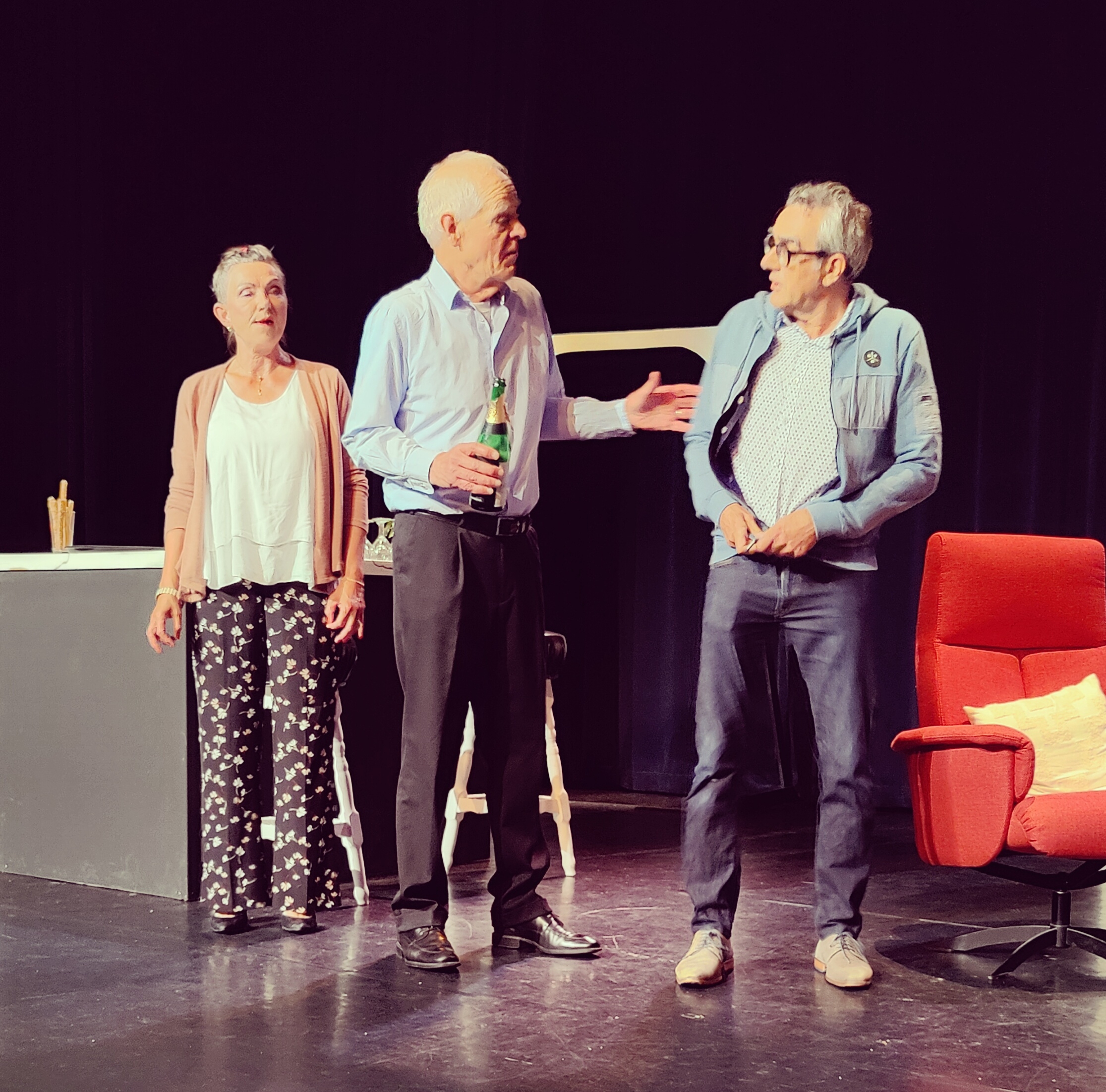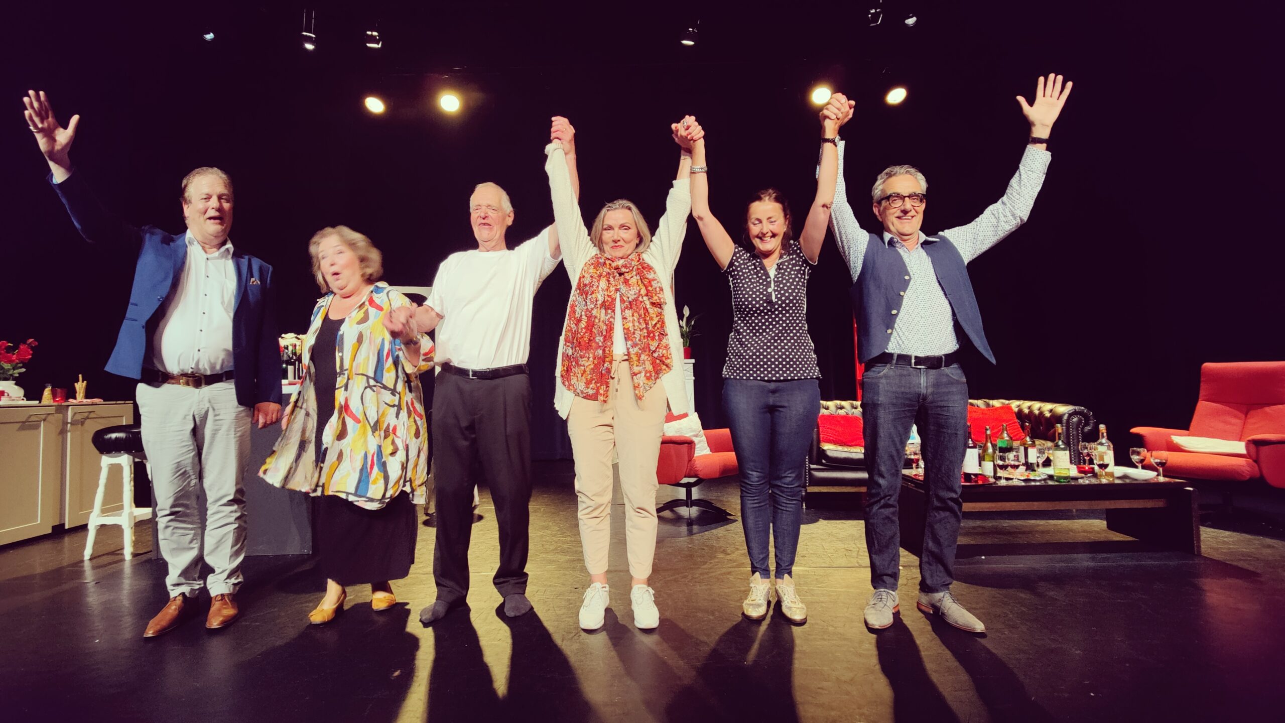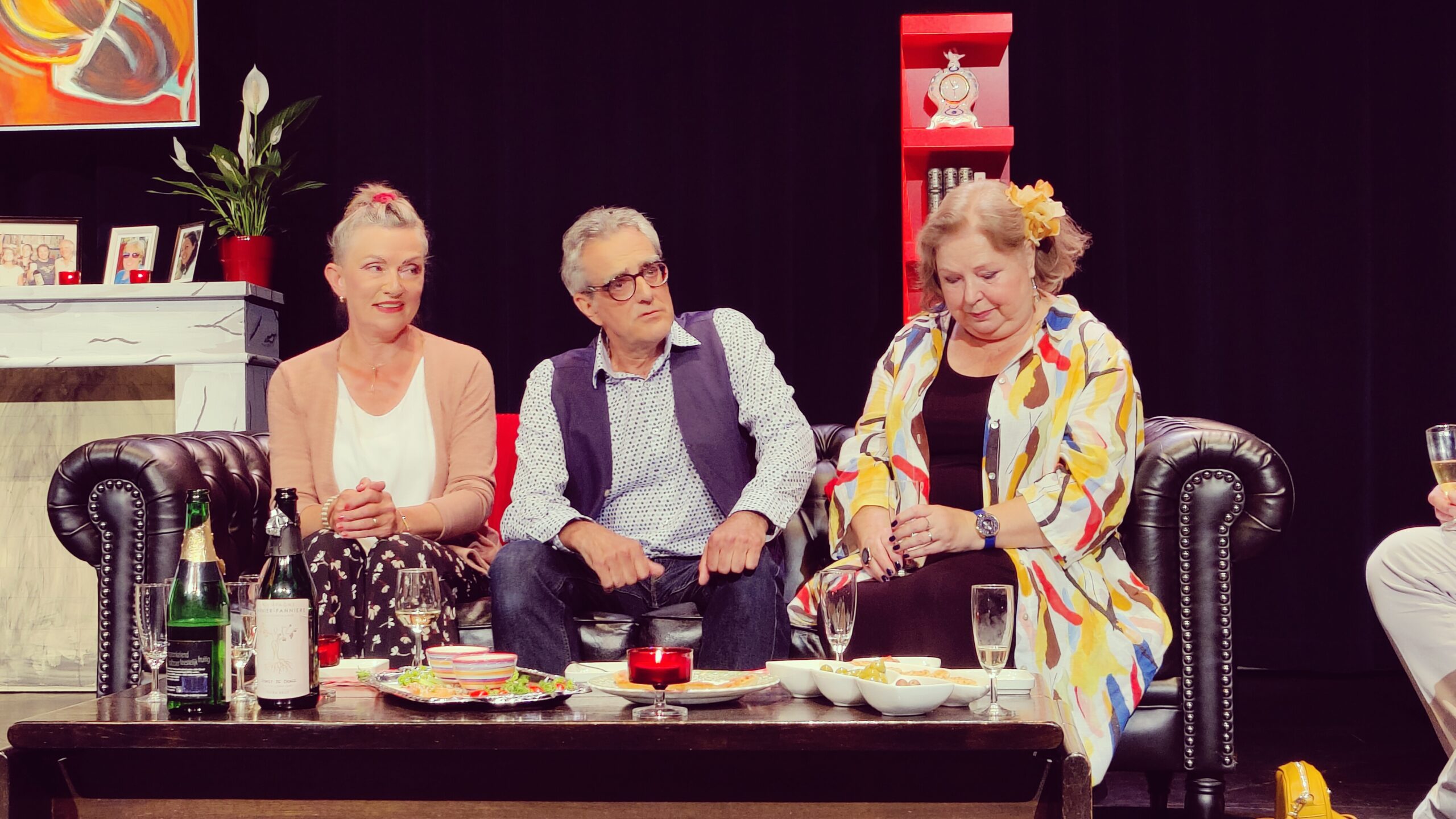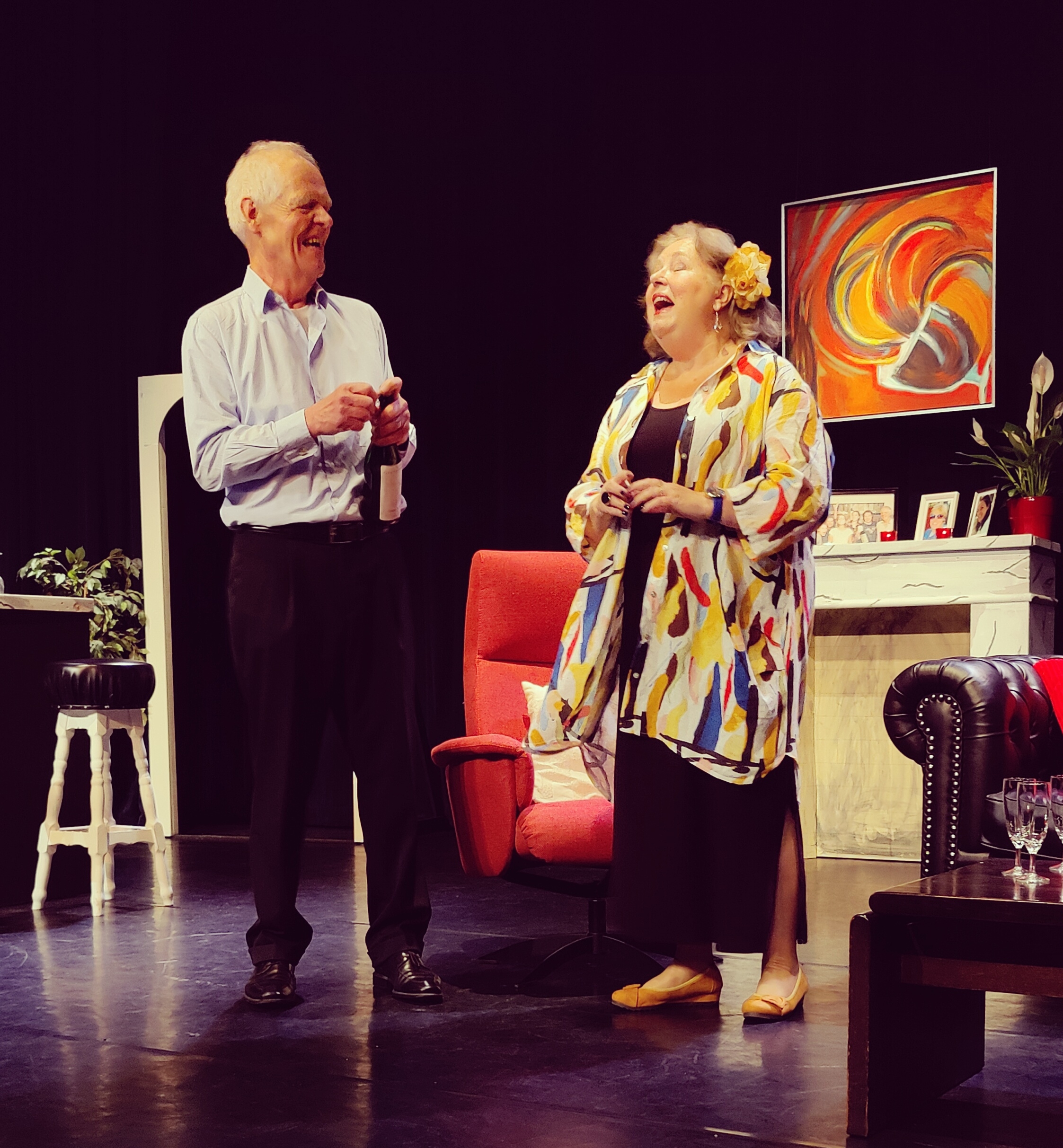 De openingstunes na het doven van het zaallicht doen in eerste instantie vermoeden dat er een soepel kabbelend wijnavondje op het programma staat. Het prominent aanwezige schilderij, dat de stijlvolle huiskamer domineert boven wat later een klein huisaltaar blijkt, is voor meer interpretaties vatbaar. Wijn maakt de tongen los tussen complexe vriendschappelijke (?) verhoudingen. Het echtpaar dat hier woont ontwikkelt zich door groot verdriet, blootgelegd door de voorstelling heen, zodanig twee kanten op, dat een scheiding onvermijdelijk lijkt. Een bekend fenomeen in het werkelijke leven bij het verlies van een kind! Gastheer Charles, vertolkt door Hans van Amsterdam, etaleert gaandeweg koortsachtig een fenomenale feitenkennis rond de geneugten van wijnproeverij. Het is prachtig om hem wanhopig zijn gevoelens te zien verbergen door telkens meer flessen uit zijn wijnkelder aan te slepen. Een kelder die overigens heel vernuftig zijdelings van het decor in beeld is gebracht en waaruit veel meer opgediept wordt dan de aanvankelijk cynische en kille gastvrouw, de met haar mimiek al zo expressieve Marijke van Amsterdam, kan verkroppen. Wijn staat hier symbool voor al wat bedekt is door de jaren heen: verbinding, maar ook splijtzwam tussen het getormenteerde echtpaar en hun pleegdochter, en de twistappel in het spel, de overleden zoon des huizes – gesymboliseerd door een exquise fles Petrus- dient sowieso niet ontkurkt te worden! Wyncko Tonckens als Bob, oude vriend des huizes, tracht goedmoedig en vol eigenwaan de gemoederen te sussen die zijn echtgenote (Cily Banus) vilein en quasi onschuldig blijft opschudden als rivaliserende carrièrevrouw en moeder. Tonckens is als acteur op zijn plaats in deze rol van nog net niet lallende levensgenieter; voor hem valt het leven soepel, voor haar met haar pretenties wrang…Ongewenste gast tegen wil en dank, Ed, gespeeld door Hans van Netburg, blijkt de stem van het geweten al eens vergeefs te hebben opgerakeld, maar wordt hier ditmaal in overtroffen door aangewaaide adoptiedochter Eveline (Caroline van der Zalm) die ondanks haar eigen mentale beschadiging met haar sprankelende verschijning kleur, licht en zelfs verzoening brengt in alle duistere onderlinge relaties en oud zeer. De eindscène waarin de twee in uiterste frictie levende moeders breken en zich verzoenen, is prachtig klein aangrijpend en geloofwaardig.