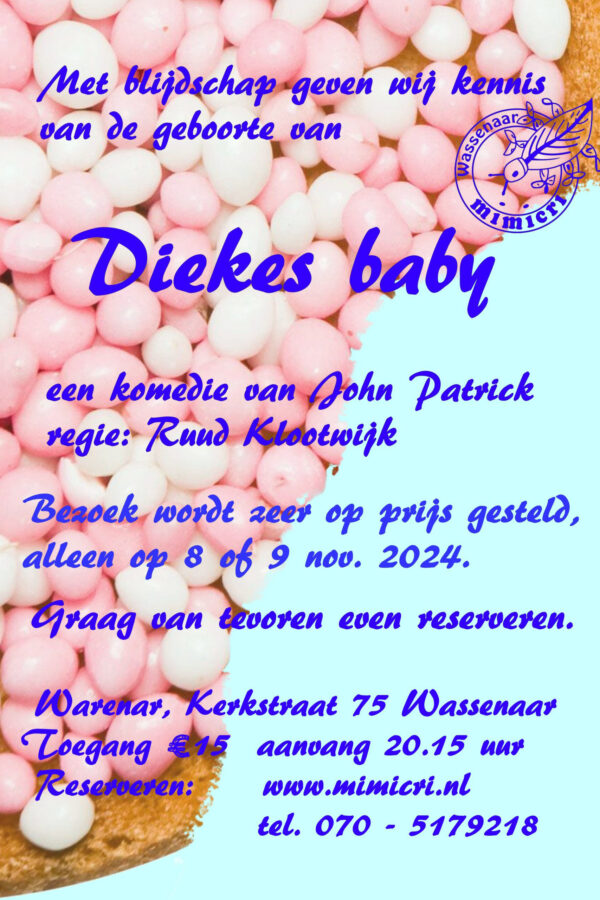 BETALING: Maak direct na uw reservering het verschuldigde bedrag (aantal kaartjes x € 15, ) over naar IBAN: NL73 INGB 0003 0605 11 t.a.v. Mimicri. Na ontvangst van de betaling is uw reservering definitief.